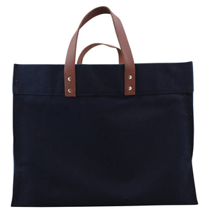 One of the most classic and versatile high end tote bags around, the Advantage Bag is a popular go-to tote bag for any occasion, especially running errands, or a impromptu picnic in the park. This elegant rich navy open top tote features two beautiful rich brown leather handles and two inner pockets; one on each side.